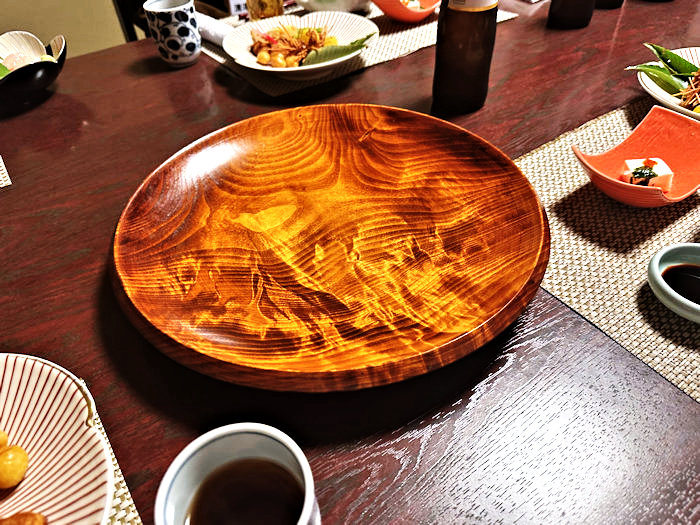 栃の木を木挽きして作られた菓子器は右端の島田さんの作品で、挨拶代わりに寄贈されました。